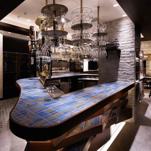 【カウンター席】バルセロナのグエル公園から影響を受け、鮮やかな青を基調とした空間です。待ち合わせや、お仕事終わりに是非お立ち寄りください!またバーとして軽く一杯のご利用もOKです!お気軽にお立ち寄りください♪